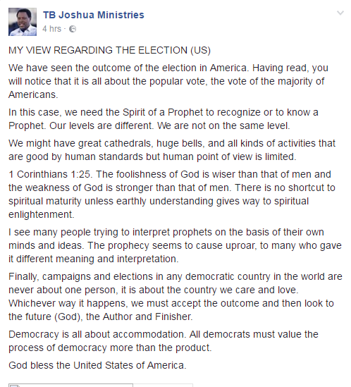 The Senior Pastor of Synagogue Church of All Nations (SCOAN) on Sunday released a statement on his Facebook Page following the outcome of the 2016 U.S Presidential Election.